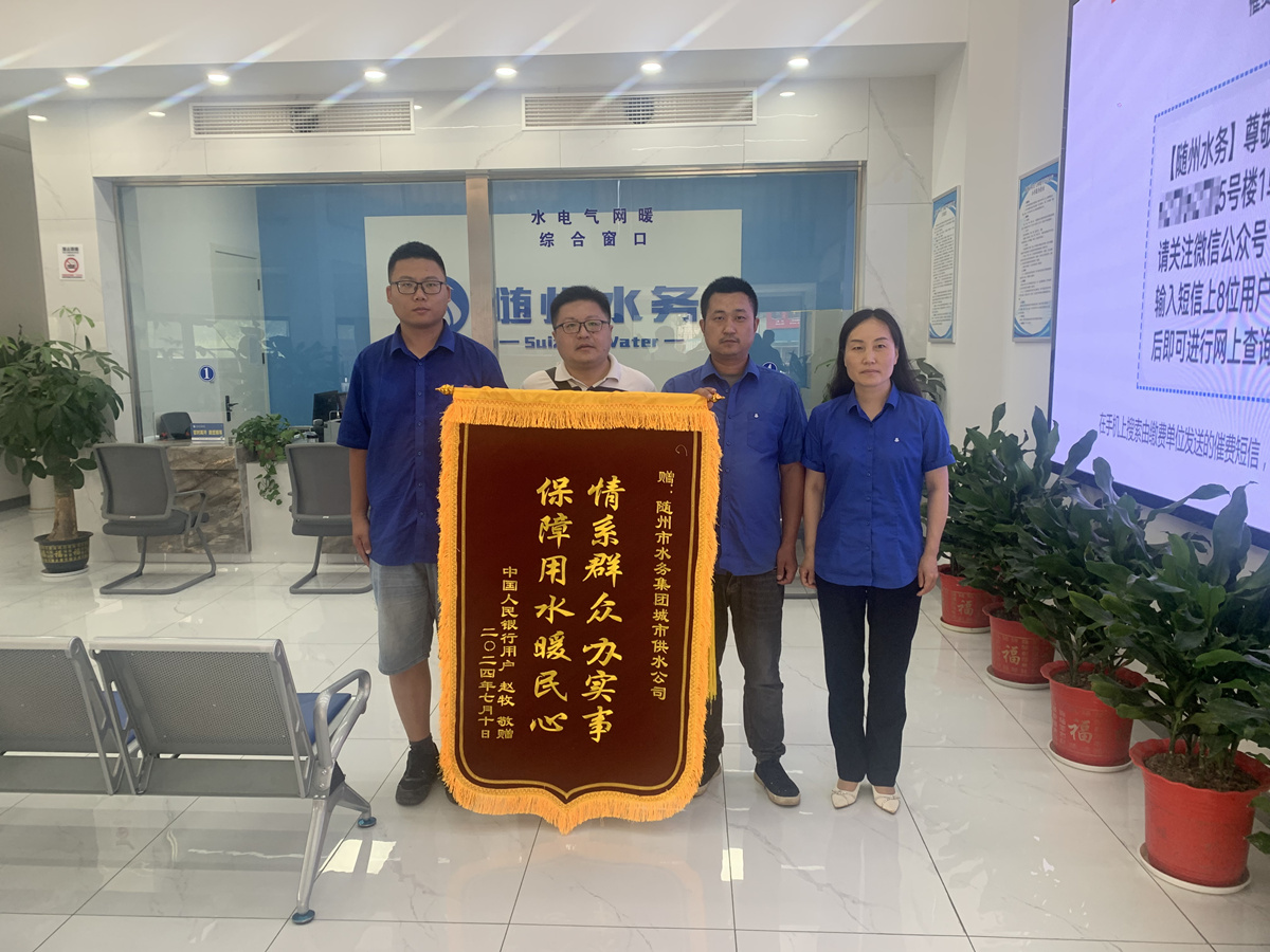 近日,中國人民銀行用戶將一面繡有“情系群眾辦實事 保障用水暖民心”的錦旗送到隨州市水務(wù)集團(tuán)城市供水公司共享營業(yè)廳。感謝運(yùn)維中心維修人員急用戶之所急、憂用戶之所憂、真心為用戶考慮,解決其用水問題。