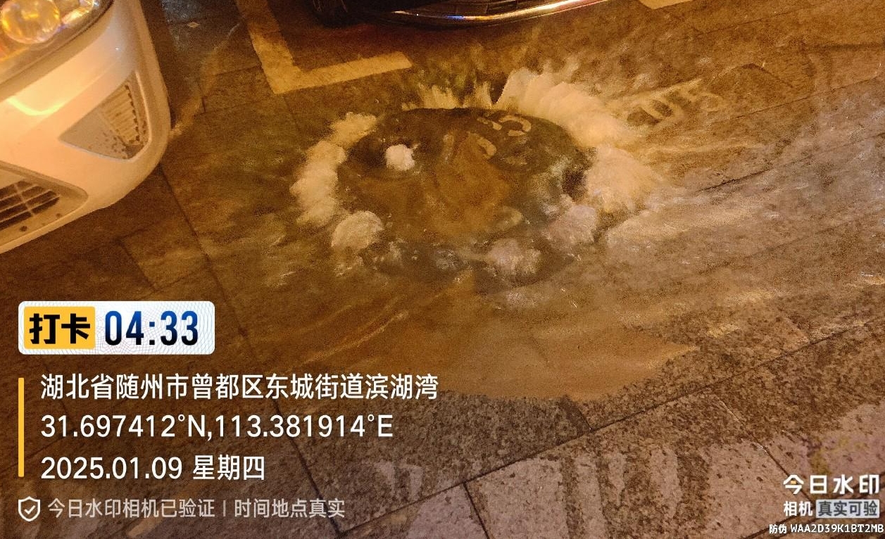 1月9日凌晨4時,隨州水務熱線電話驟然響起?!盀I湖灣小區(qū)門口水管破裂,水一直在往外冒!”電話那頭,群眾焦急的聲音傳來。這通熱線,如同戰(zhàn)斗的沖鋒號,城市供水公司運維中心工作人員迅速響應,在接到指令的第一時間,便迎著刺骨的寒風奔赴現場。