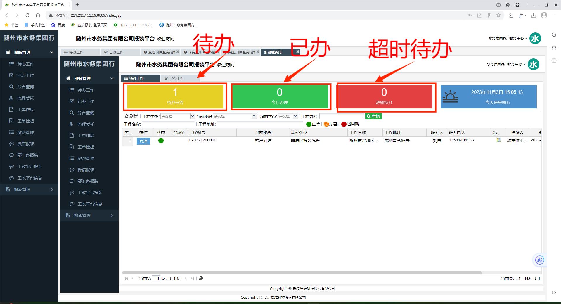 報裝業(yè)務管理系統(tǒng)通過流程監(jiān)測,對“待辦,已辦,超時待辦”的業(yè)務進行分別處理,保證業(yè)務有效流轉,及時辦結。
