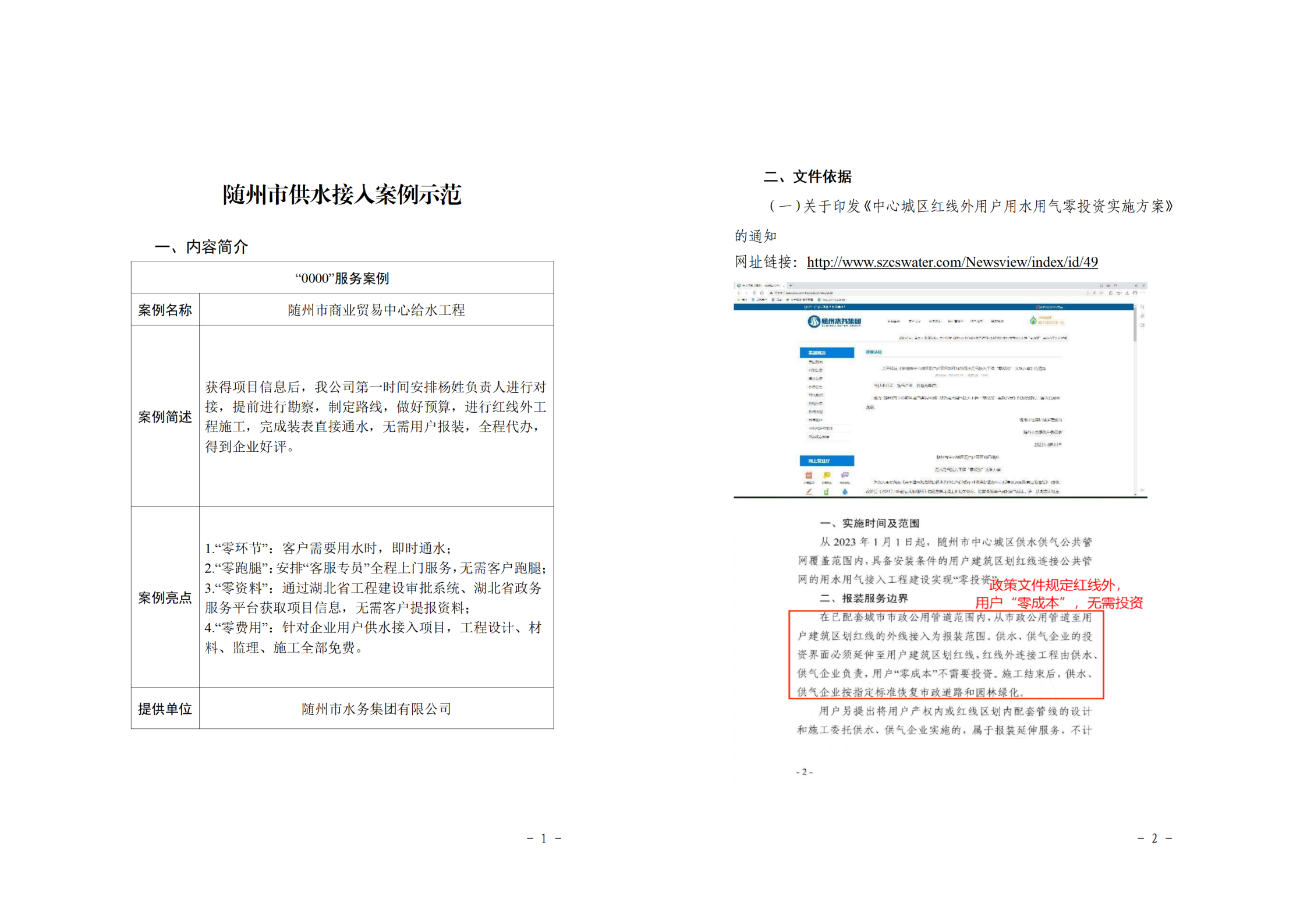 隨州市水務(wù)集團(tuán)主要職責(zé)是向隨州市中心城區(qū)、曾都區(qū)、隨縣以及高新區(qū)提供供水服務(wù),集團(tuán)公司下轄城市供水公司、建設(shè)工程公司、水質(zhì)檢測(cè)公司、隨縣供水公司、康潤實(shí)業(yè)公司5家全資子公司。下面展示隨州市中心城區(qū)供水接入案例示范。