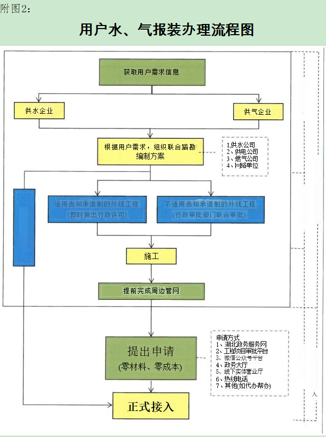 (一)免費(fèi)申請。 用戶通過政務(wù)服務(wù)網(wǎng)、供水供氣網(wǎng)上營業(yè)廳、微信公眾號、各營業(yè)網(wǎng)點(diǎn)等方式提出用水用氣接入申請。